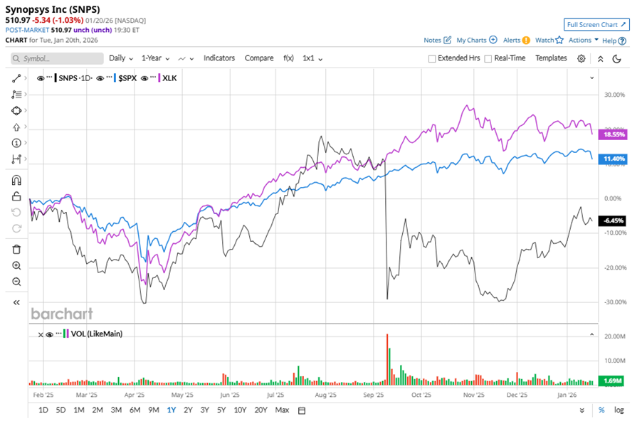 SNPS stock has underperformed the S&P 500 Index’s ($SPX) 13.3% gains over the past 52 weeks, with shares down 3% during this period. Similarly, it underperformed the Technology Select Sector SPDR Fund’s (XLK) 21.2% gains over the same time frame.