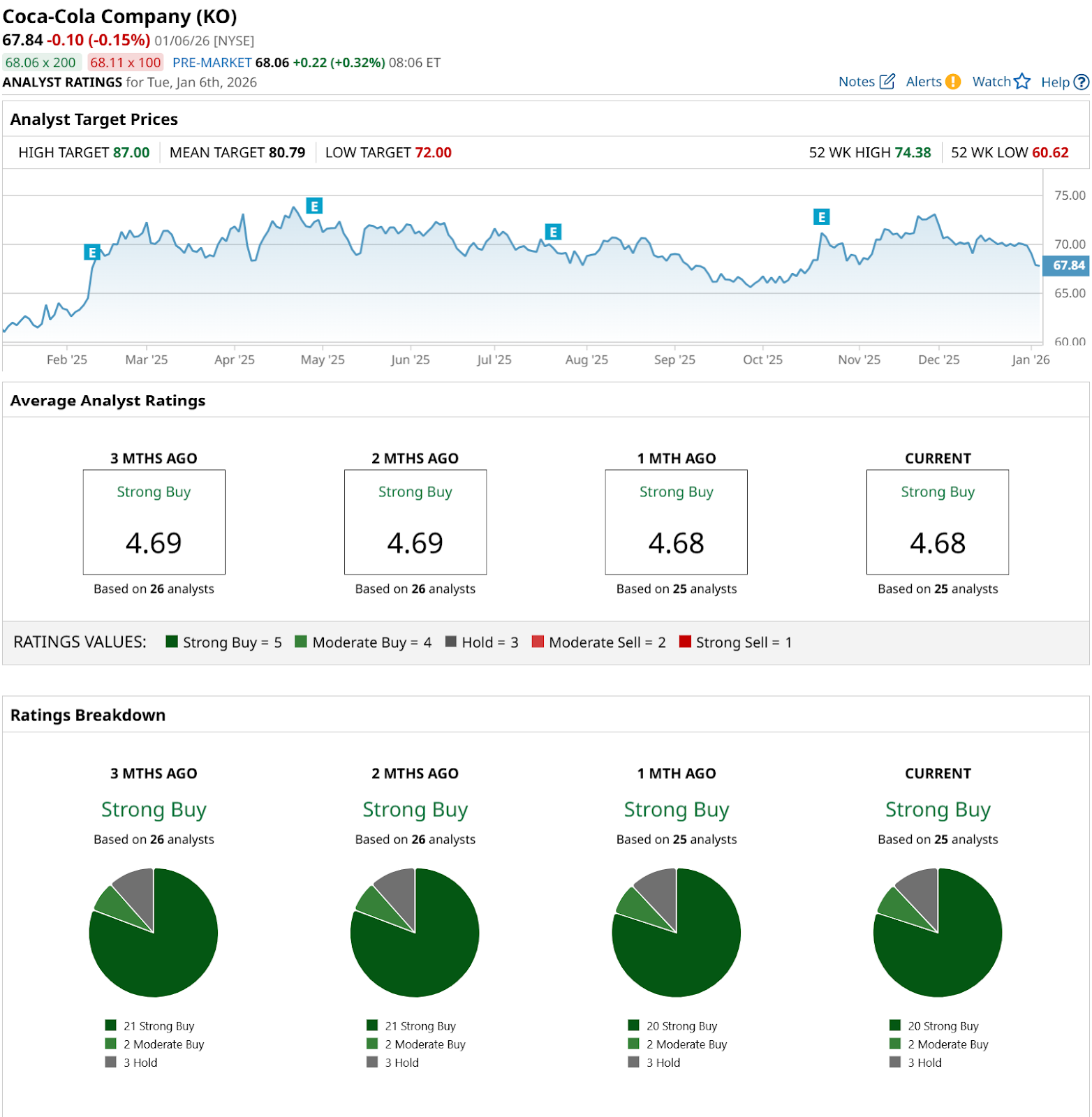 Analysts remain upbeat, rating KO stock as a consensus “Strong Buy." The $80.83 average price target implies about 16% potential upside from the current price.