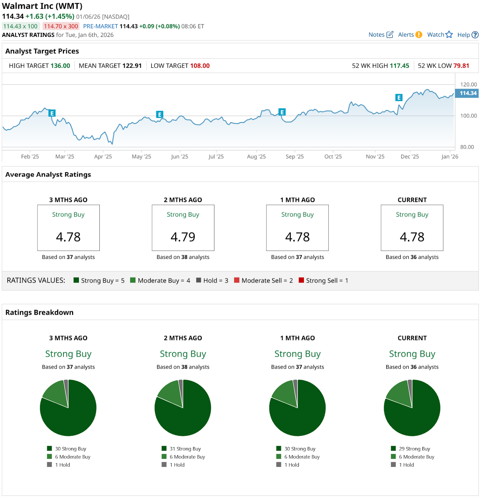 Wall Street remains strongly positive on WMT stock. The 36 analysts with coverage of shares rate WMT a consensus “Strong Buy." The average price target of $123.40 suggests about 9% potential upside from the current price.