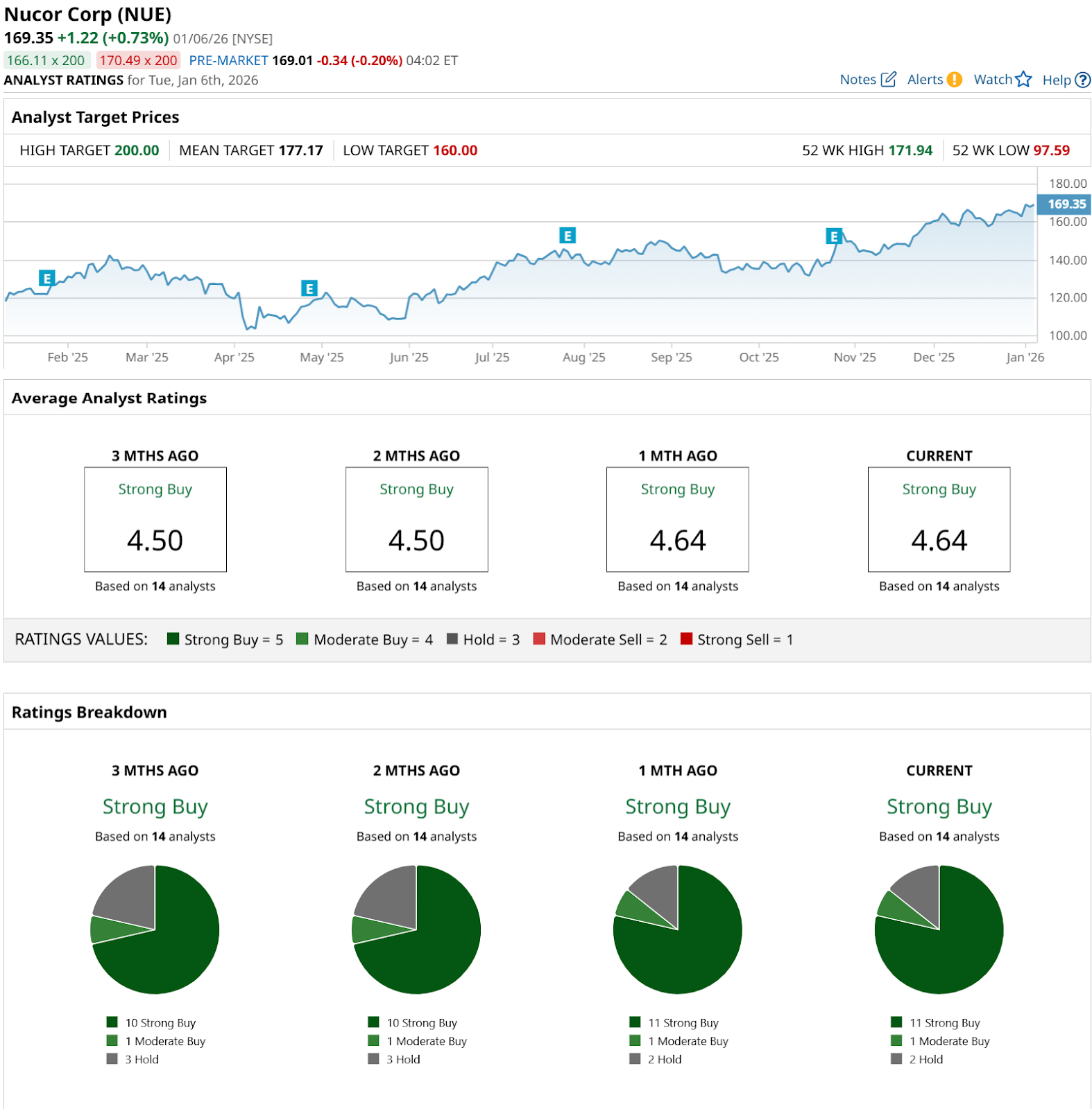 Analyst sentiment is positive, with NUE stock having a consensus “Strong Buy" rating. The $178.83 average price target implies about 7% potential upside from the current price.