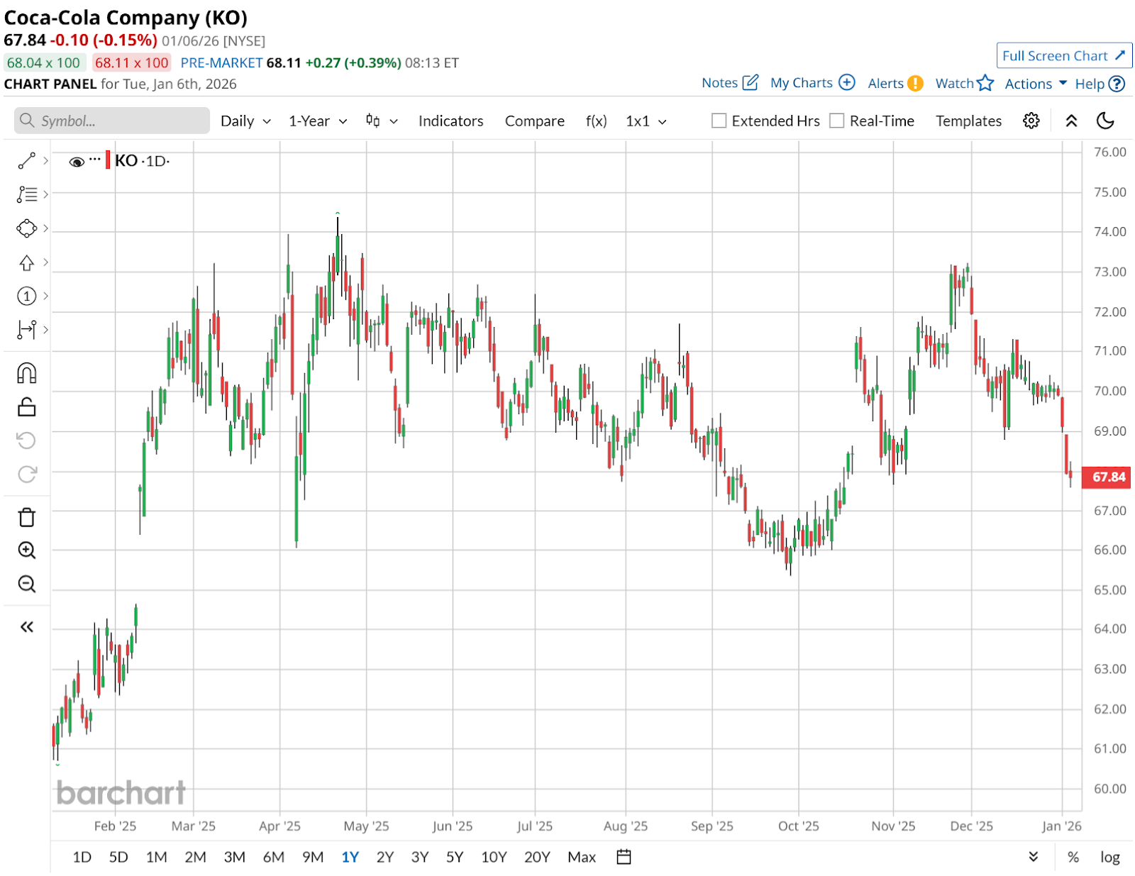 The performance of KO stock lines up with what many dividend investors look for heading into 2026. KO stock is up 12% over the past 52 weeks, although shares are down 1% on a YTD basis.